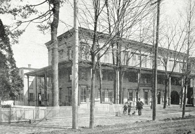 “A popular gathering place for well over a century, the Indian Queen Hotel on Main Street in Stroudsburg is featured in this c.1898 image from our collection. The Indian Queen served as a stagecoach stop beginning in the 1820s, and the first automobile to visit Stroudsburg stopped at the hotel in 1899. Throughout the years, the hotel’s banquet rooms hosted numerous community events and civic leaders. The Indian Queen was torn down in 1963 to build First Security Bank, now Citizens Bank.”