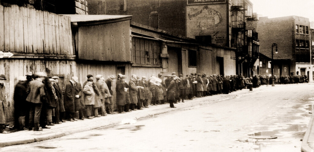 Great Depression Breadline At McCauley Water Street Mission Under Brooklyn Bridge –  Photograph taken by Ewing Galloway circa 1930 – 1934.